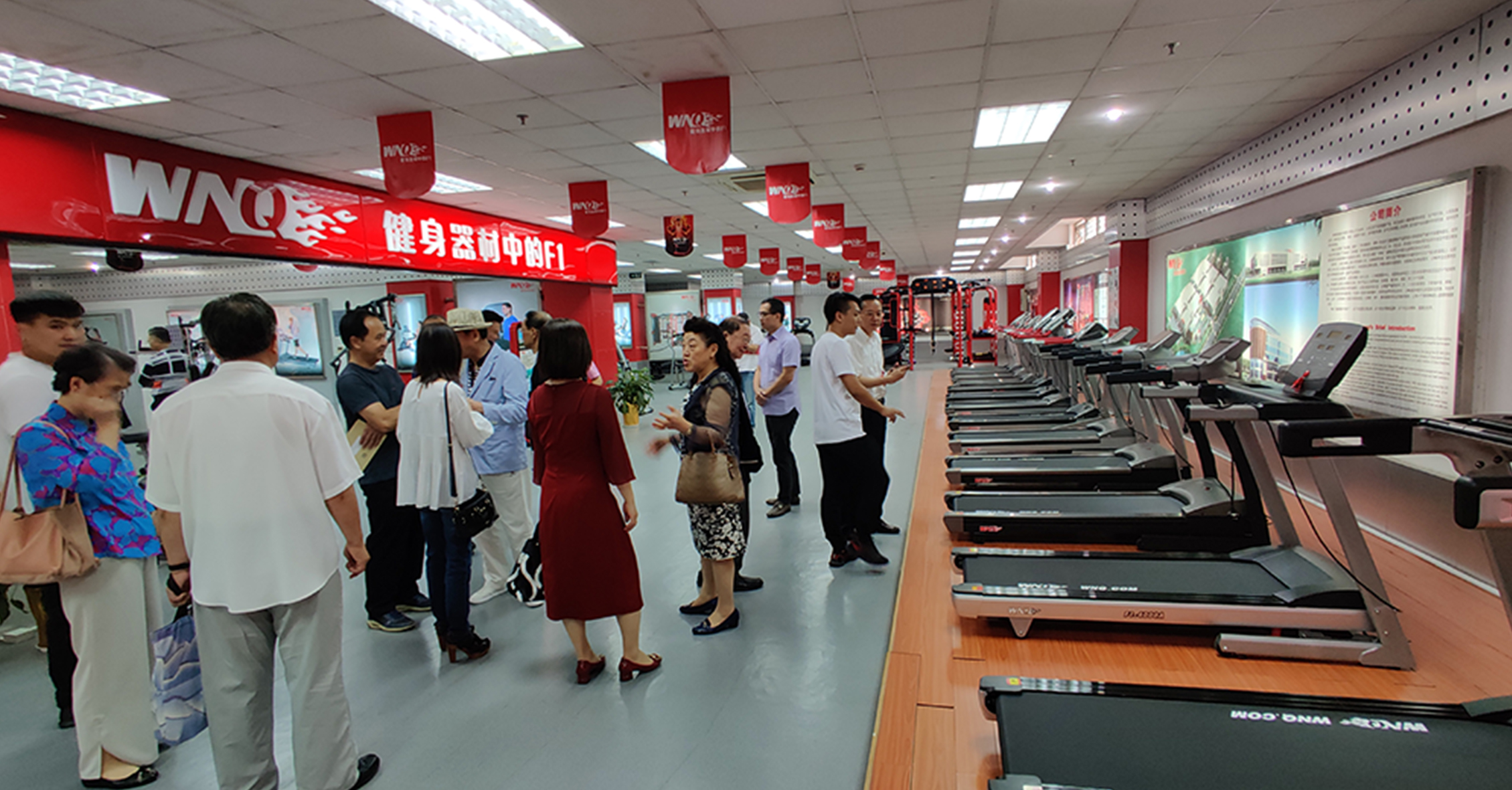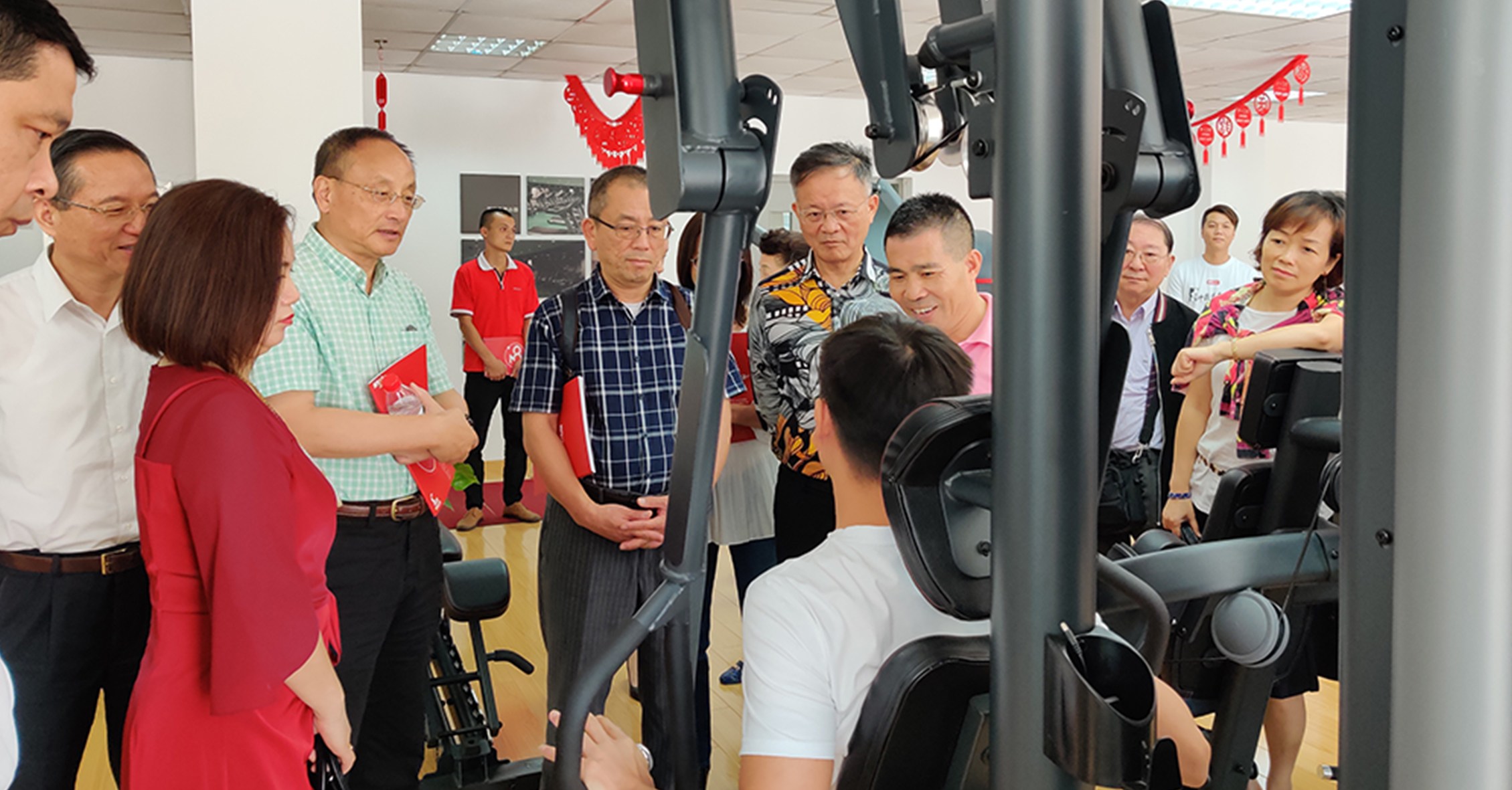 首先,来宾一行参观考察了jiuyou.com的文化长廊,对我司的发展历程、企业文化、企业特色等方面进行初步了解。在参观一楼与负一楼展厅过程中,来宾一行对jiuyou.com种类齐全的健身器材表现出浓厚的兴趣。